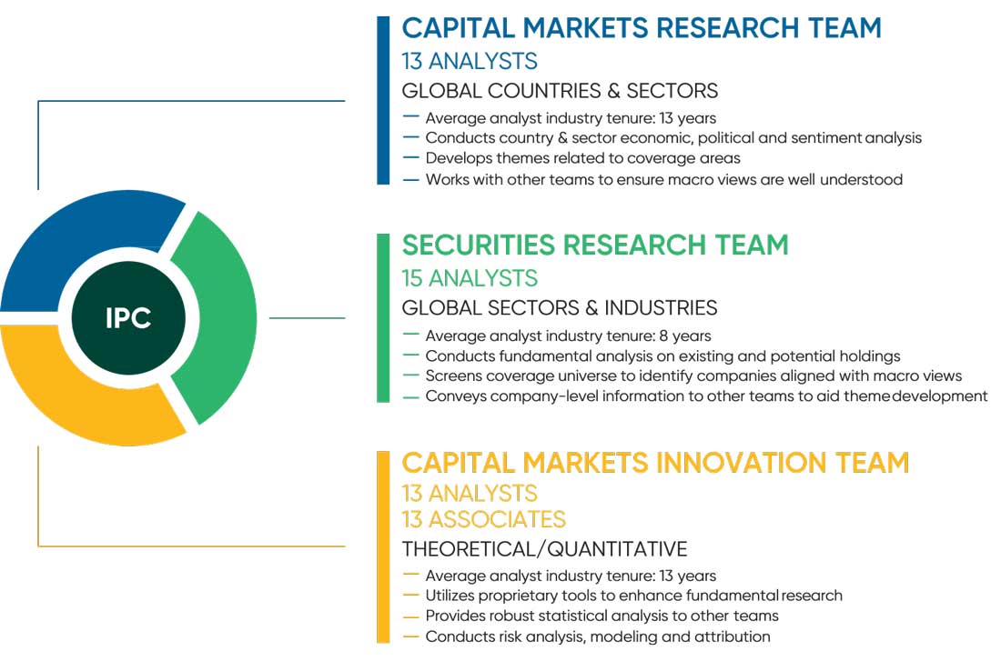 The department is organized into teams with unique responsibilities, including analyzing macroeconomic trends, monitoring every investment sector and major country around the world, evaluating individual securities, calculating performance attribution, and implementing the IPC's portfolio decisions.